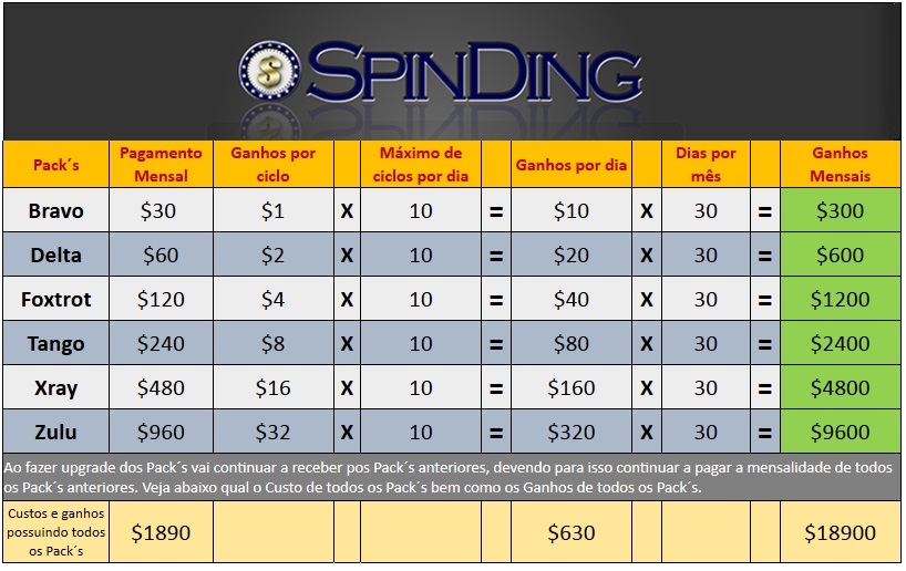 A cada 4 pessoas que entram, EM QUALQUER LUGAR DO MUNDO, você cicla e ganha. Para tal basta fazer o registo na Spinding indicar 2 pessoas ou comprar mais 2 contas para associar à 1ª conta e começar a Ganhar. O preço dos Packs varia, veja abaixo na imagem.